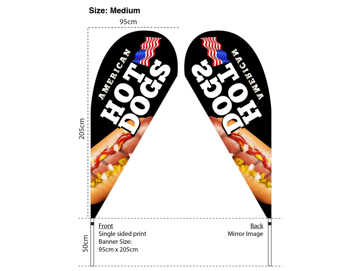 Create an authentic American hot dog experience for your customers with our American Hot Dog flag, featuring a mouthwatering picture of a delicious hot dog. This flag is sure to make a lasting impression and evoke a true taste of America for your valued cu
