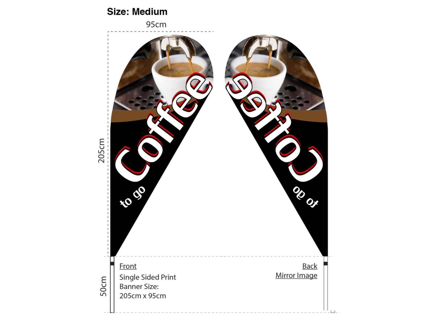 Introducing our contemporary "Coffee to Go" teardrop flag with an eye-catching design. Perfect for coffee shops and cafes, this flag adds a touch of contemporary style to any setting. Let the world know you're ready to serve up delicious coffee on the go w
