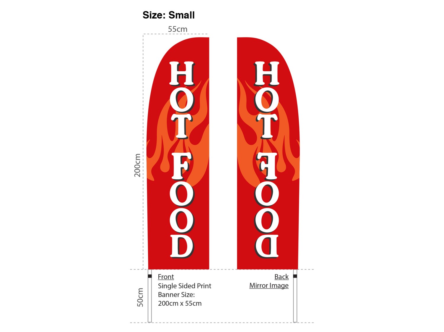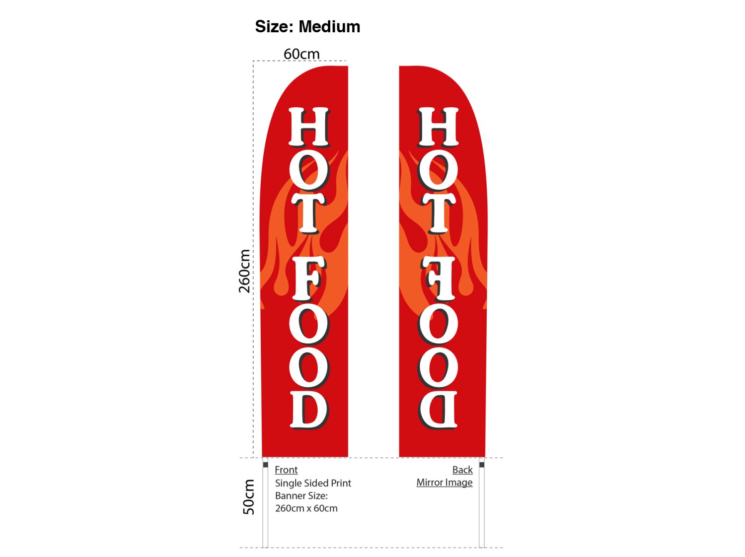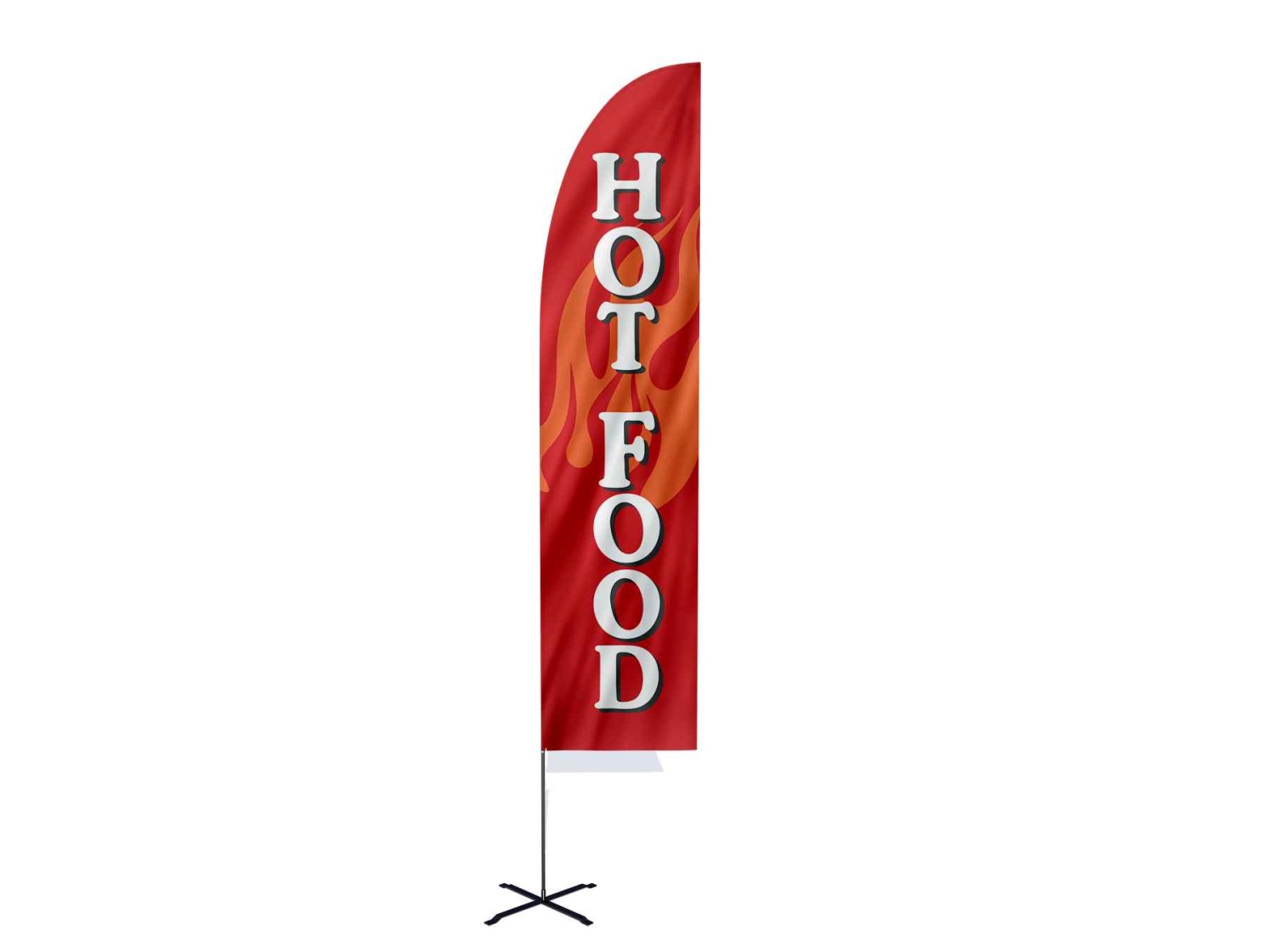Make a powerful visual impact for your restaurant or catering business with our Hot Food flag. Featuring an eye-catching bright red flag and a captivating flames illustration as the background, this flag is sure to grab attention and draw customers in with