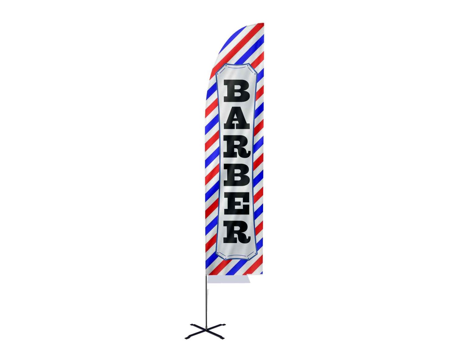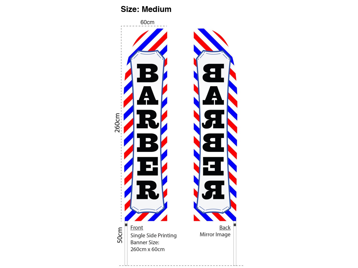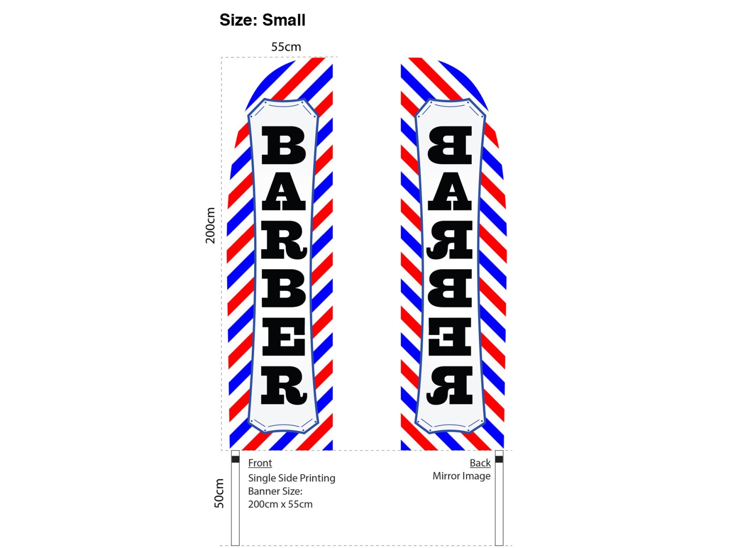 Catch attention and boost sales with our Barber flag, showcasing an Egyptian-style font and classic barber stripes. This flag is designed to captivate passersby, creating a visually appealing display that will draw customers to your barber shop.